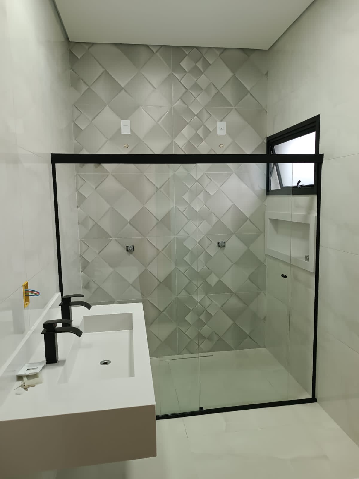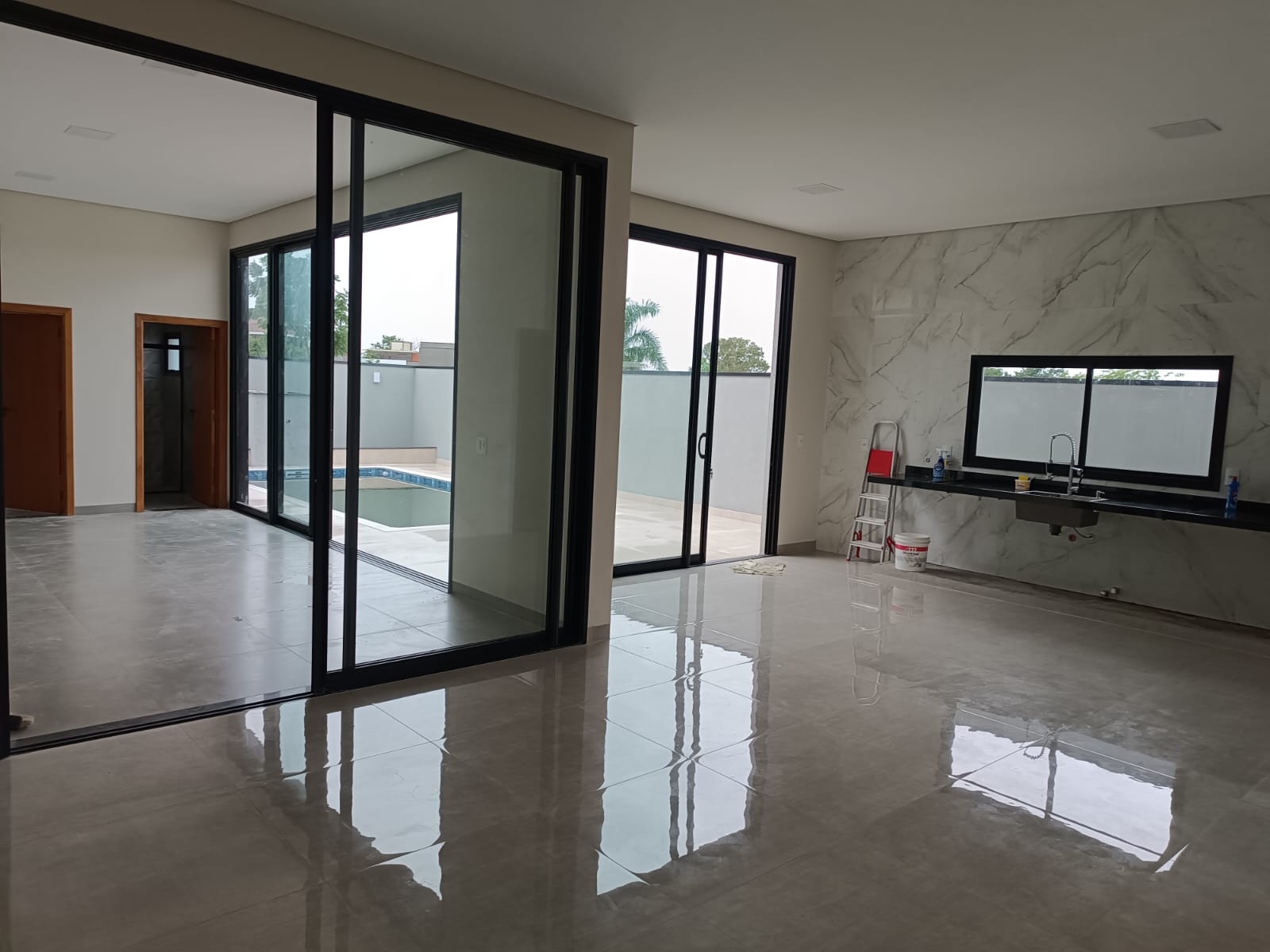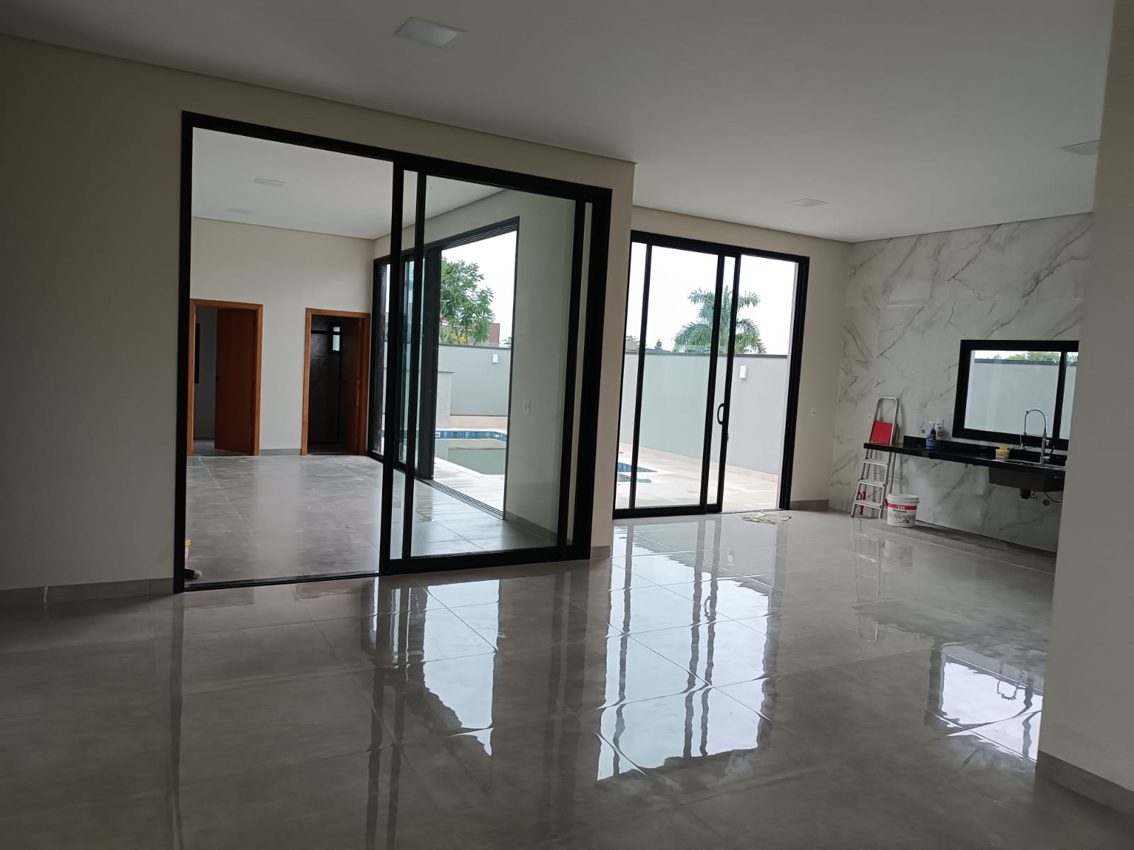 Pé direito duplo nas salas e cozinha, fechamento da cozinha e varanda gourmet com esquadrias de alumínio e blindex.
